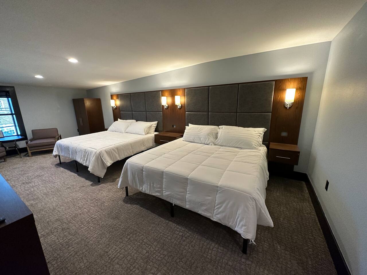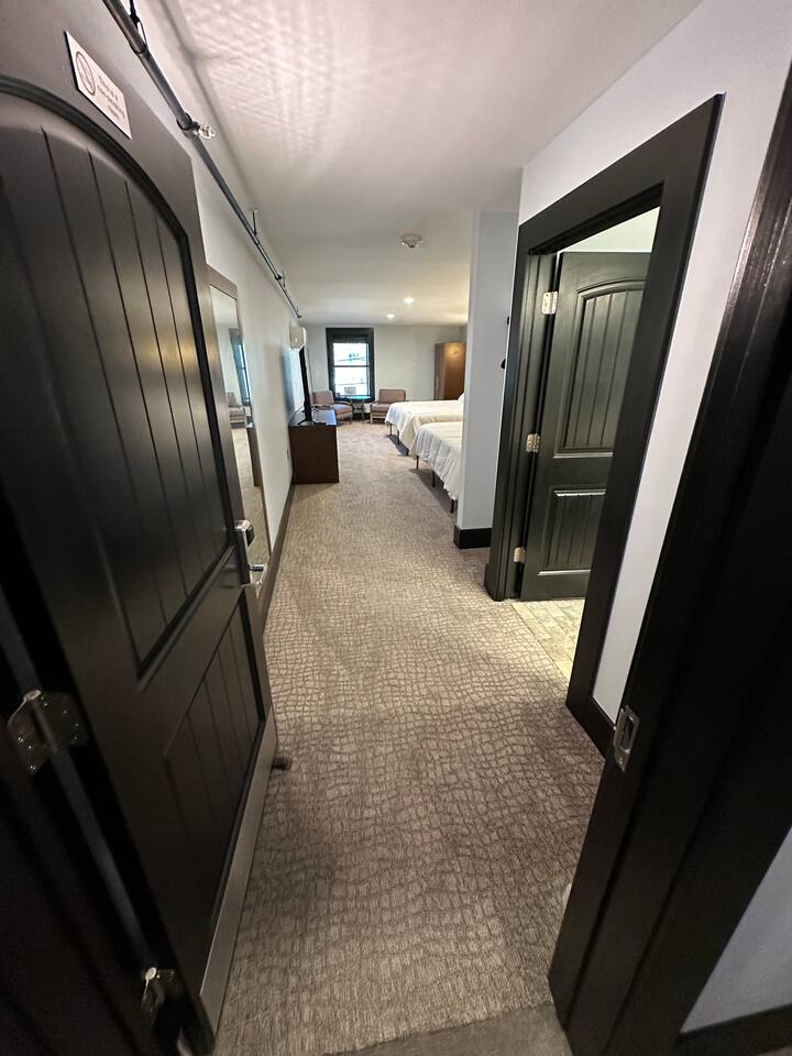 Welcome to our spacious and inviting hotel room, the perfect oasis for your stay. This well-appointed accommodation features two luxurious king-sized beds, ensuring a restful night’s sleep for you and your fellow travelers. A 65” flat-screen television takes center stage, offering a wide range of entertainment options to unwind after a day of adventures. Stay connected effortlessly with our high-speed WiFi, perfect for both work and leisure. For climate control, a remote-controllable thermostat allows you to tailor the room’s temperature to your preference, ensuring your comfort year-round. A soothing ceiling fan adds an extra layer of climate control, providing a gentle breeze on warm days. If business is on your agenda, our well-equipped room boasts a dedicated work area with a desk, making it easy to stay productive. And when you’re ready to relax, a cozy sitting area beckons for moments of tranquility or a chance to sit back and read a book. Our hotel room offers a harmonious blend of comfort, convenience, and sophistication, promising a memorable stay for all our guests.