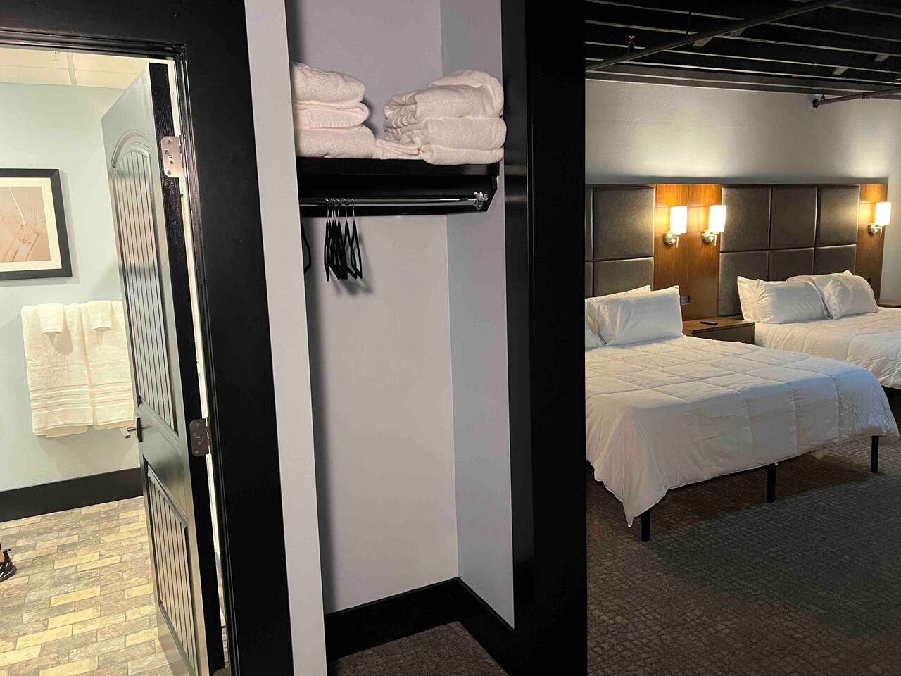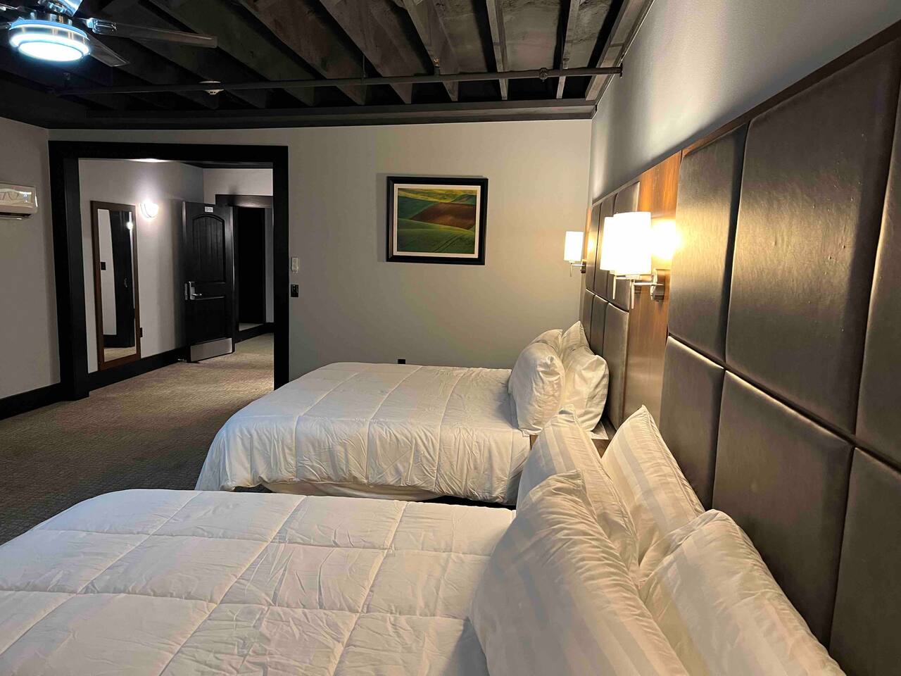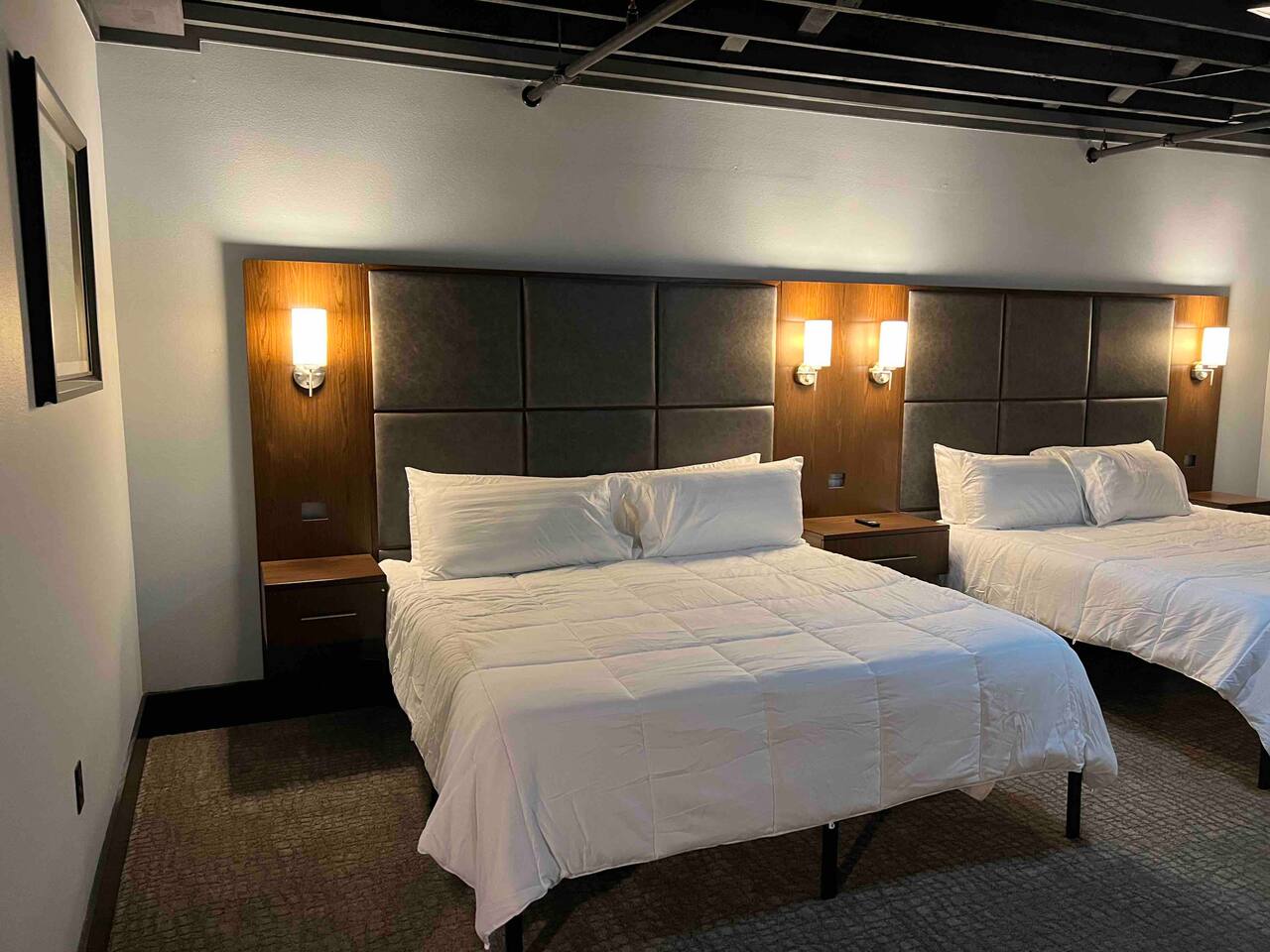 Welcome to our spacious and inviting hotel room, the perfect oasis for your stay. This well-appointed accommodation features two luxurious king-sized beds, ensuring a restful night’s sleep for you and your fellow travelers. A 65” flat-screen television takes center stage, offering a wide range of entertainment options to unwind after a day of adventures. Stay connected effortlessly with our high-speed WiFi, perfect for both work and leisure. For climate control, a remote-controllable thermostat allows you to tailor the room’s temperature to your preference, ensuring your comfort year-round. A soothing ceiling fan adds an extra layer of climate control, providing a gentle breeze on warm days. If business is on your agenda, our well-equipped room boasts a dedicated work area with a desk, making it easy to stay productive. And when you’re ready to relax, a cozy sitting area beckons for moments of tranquility or a chance to sit back and read a book. Our hotel room offers a harmonious blend of comfort, convenience, and sophistication, promising a memorable stay for all our guests