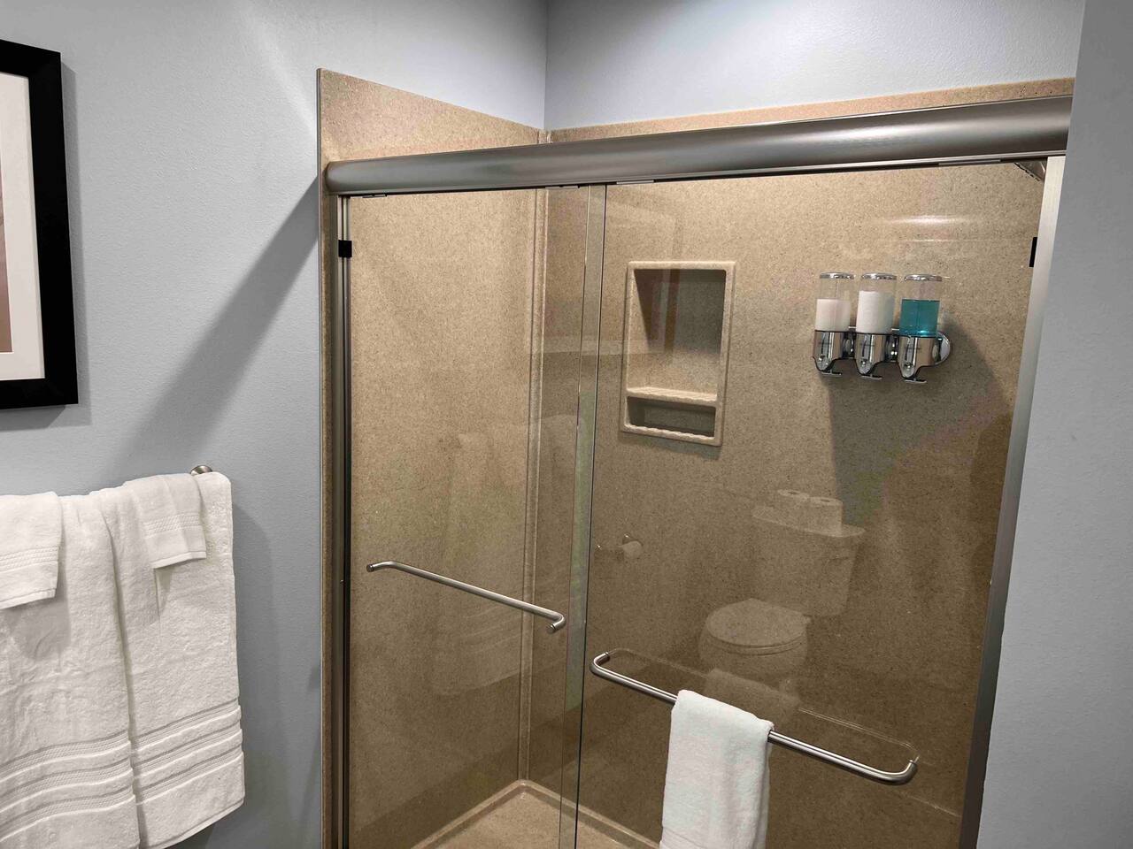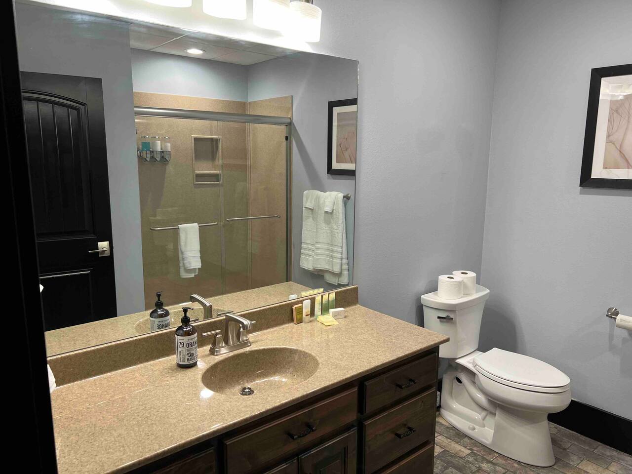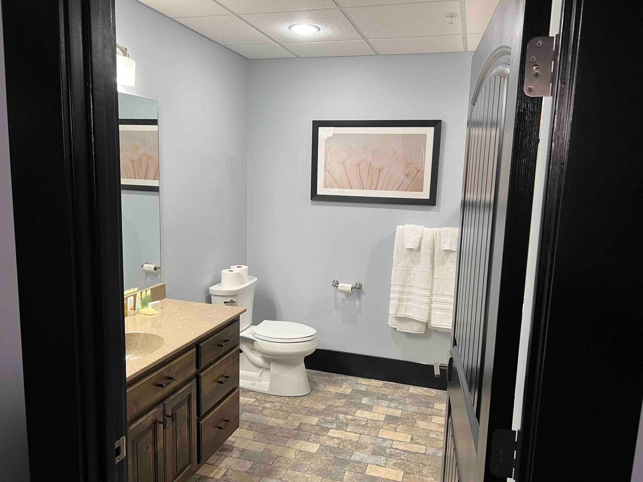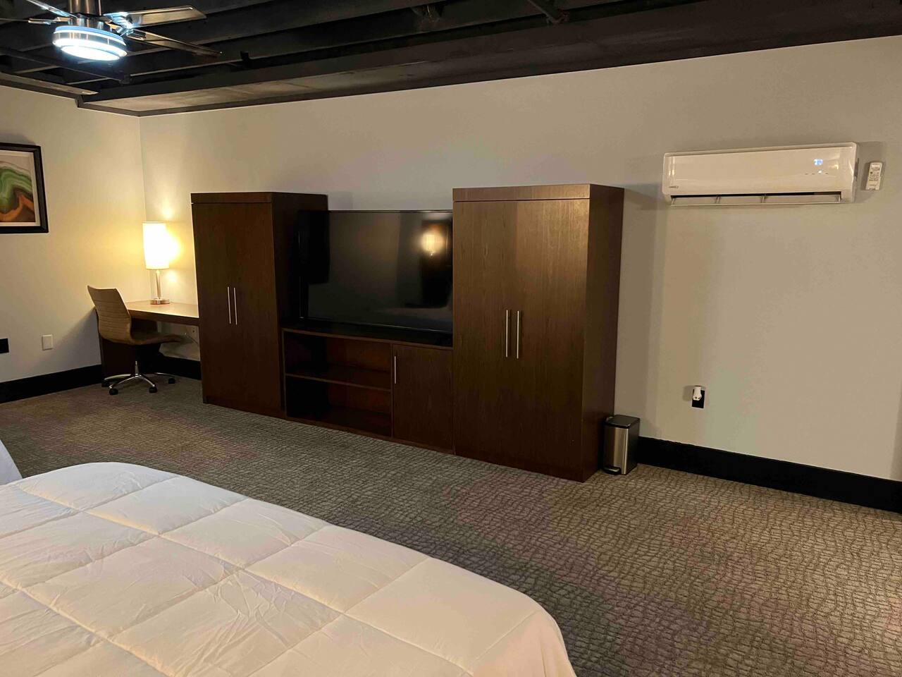 Welcome to our spacious and inviting hotel room, the perfect oasis for your stay. This well-appointed accommodation features two luxurious king-sized beds, ensuring a restful night’s sleep for you and your fellow travelers. A 65” flat-screen television takes center stage, offering a wide range of entertainment options to unwind after a day of adventures. Stay connected effortlessly with our high-speed WiFi, perfect for both work and leisure. For climate control, a remote-controllable thermostat allows you to tailor the room’s temperature to your preference, ensuring your comfort year-round. A soothing ceiling fan adds an extra layer of climate control, providing a gentle breeze on warm days. If business is on your agenda, our well-equipped room boasts a dedicated work area with a desk, making it easy to stay productive. And when you’re ready to relax, a cozy sitting area beckons for moments of tranquility or a chance to sit back and read a book. Our hotel room offers a harmonious blend of comfort, convenience, and sophistication, promising a memorable stay for all our guests