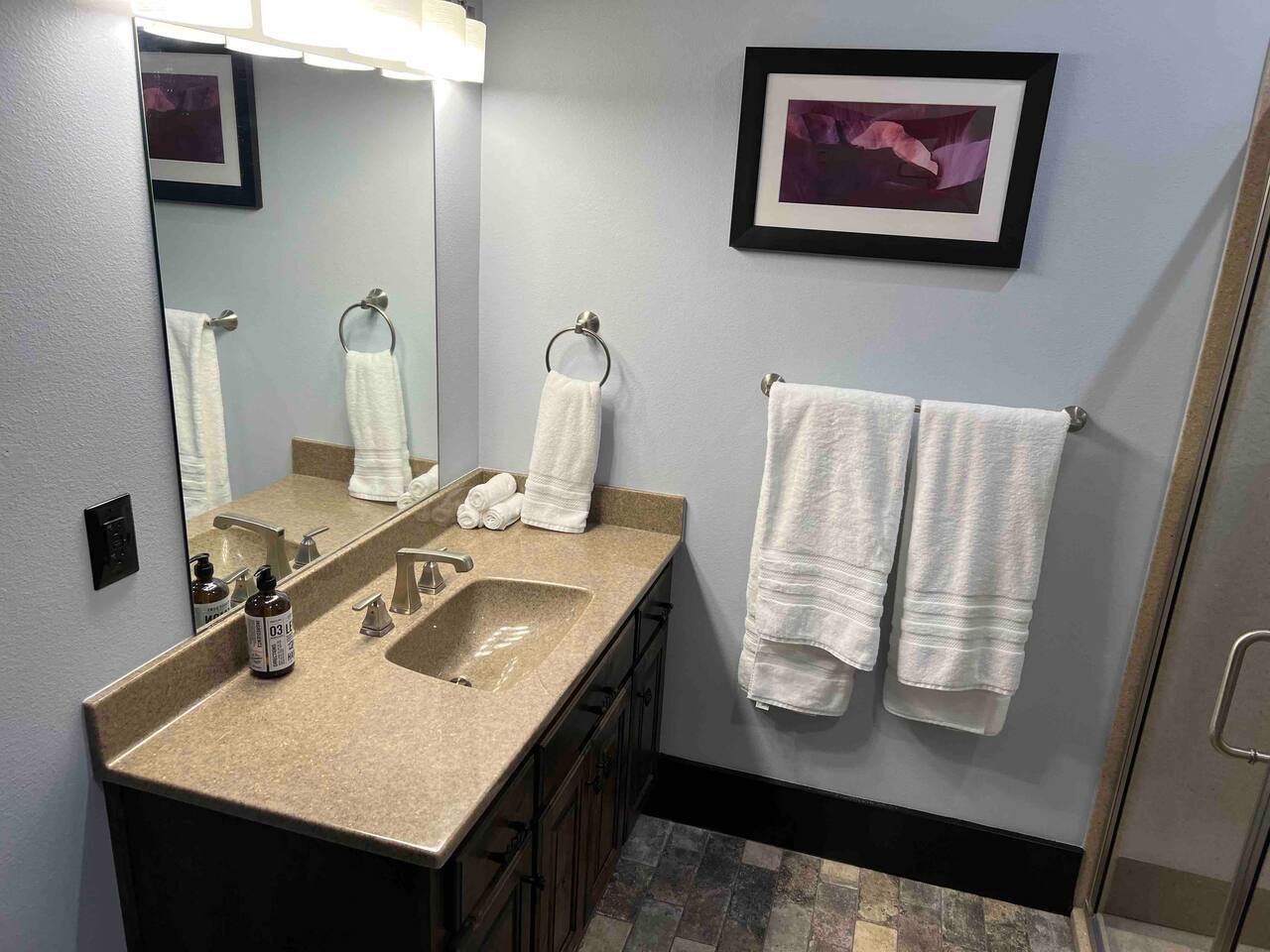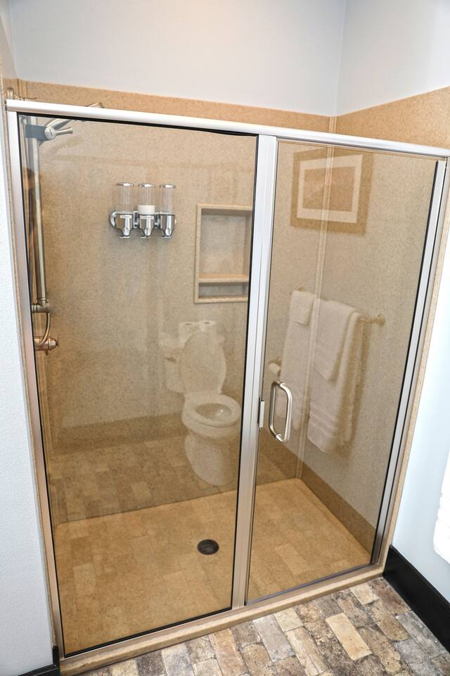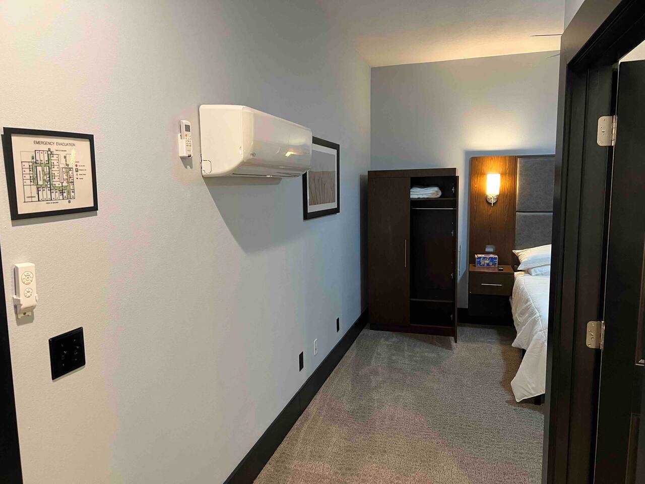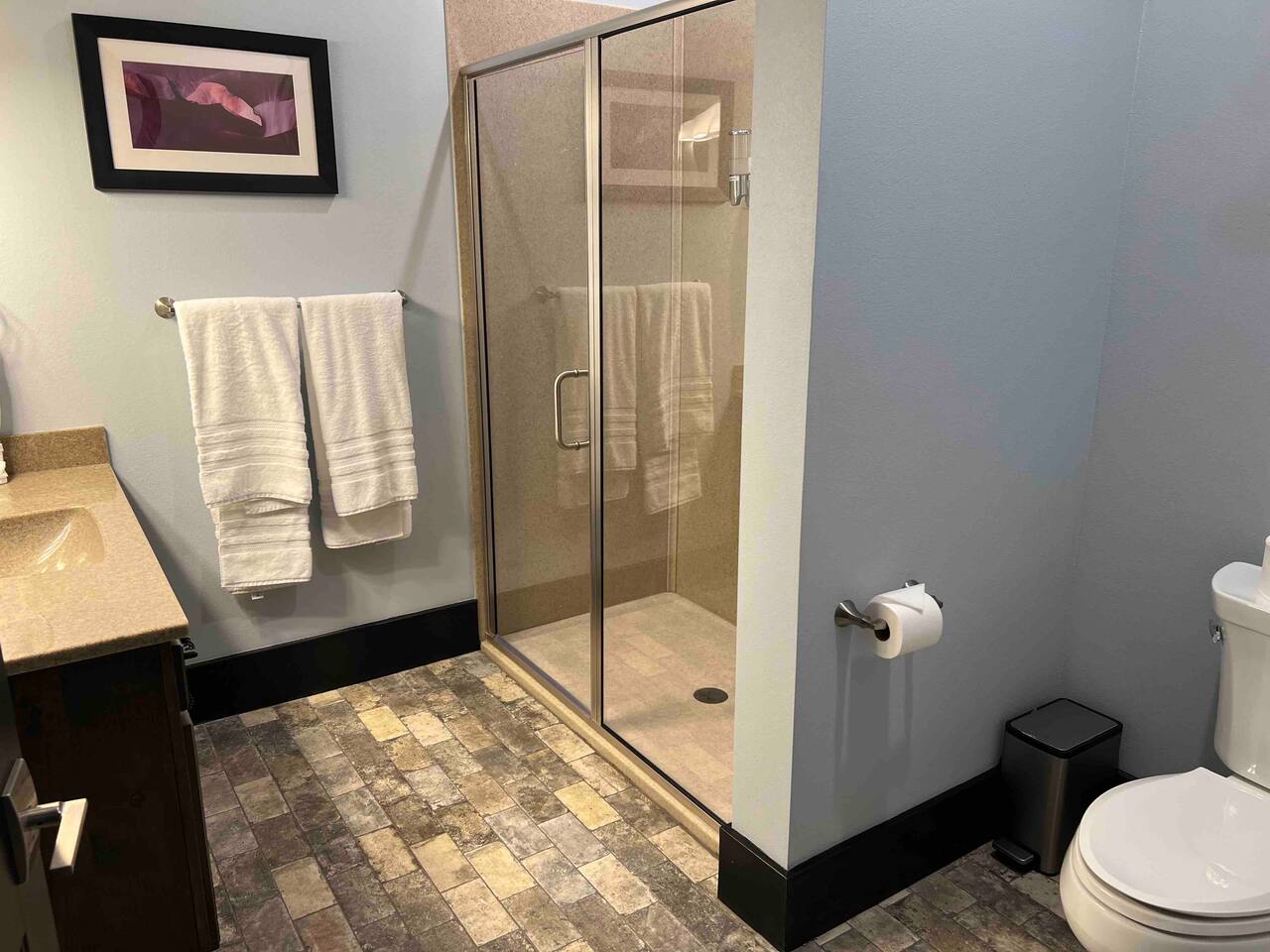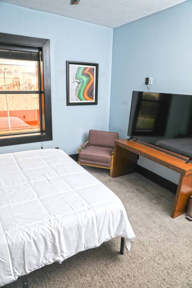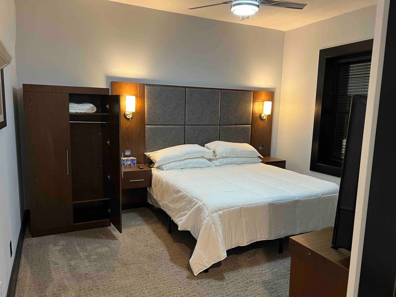 Welcome to our spacious and inviting hotel room, the perfect oasis for your stay. This well-appointed accommodation features two luxurious king-sized beds, ensuring a restful night’s sleep for you and your fellow travelers. A 65” flat-screen television takes center stage, offering a wide range of entertainment options to unwind after a day of adventures. Stay connected effortlessly with our high-speed WiFi, perfect for both work and leisure. For climate control, a remote-controllable thermostat allows you to tailor the room’s temperature to your preference, ensuring your comfort year-round. A soothing ceiling fan adds an extra layer of climate control, providing a gentle breeze on warm days. If business is on your agenda, our well-equipped room boasts a dedicated work area with a desk, making it easy to stay productive. And when you’re ready to relax, a cozy sitting area beckons for moments of tranquility or a chance to sit back and read a book. Our hotel room offers a harmonious blend of comfort, convenience, and sophistication, promising a memorable stay for all our guests.
