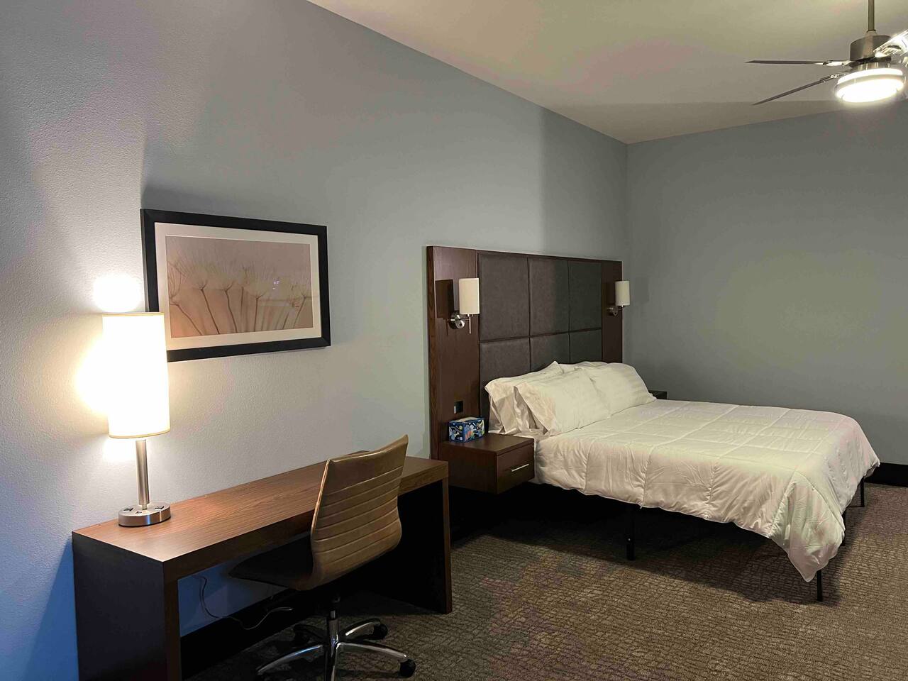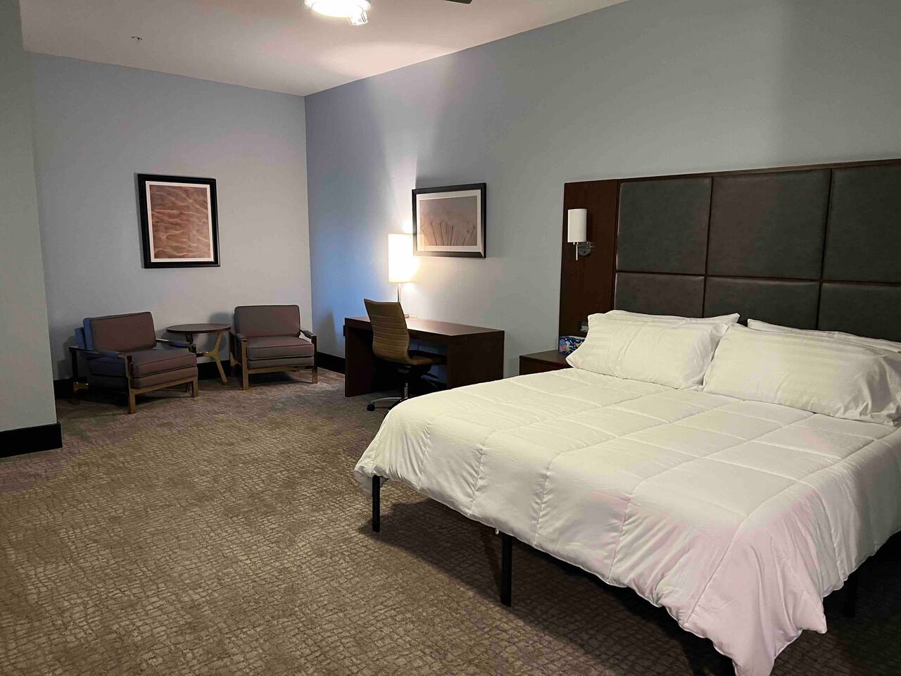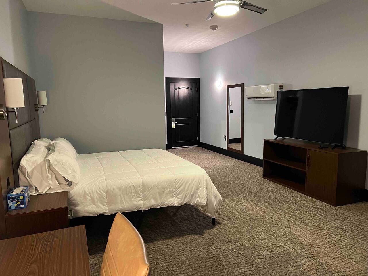Welcome to our spacious and inviting hotel room, the perfect oasis for your stay. This well-appointed accommodation features two luxurious king-sized beds, ensuring a restful night’s sleep for you and your fellow travelers. A 65” flat-screen television takes center stage, offering a wide range of entertainment options to unwind after a day of adventures. Stay connected effortlessly with our high-speed WiFi, perfect for both work and leisure. For climate control, a remote-controllable thermostat allows you to tailor the room’s temperature to your preference, ensuring your comfort year-round. A soothing ceiling fan adds an extra layer of climate control, providing a gentle breeze on warm days. If business is on your agenda, our well-equipped room boasts a dedicated work area with a desk, making it easy to stay productive. And when you’re ready to relax, a cozy sitting area beckons for moments of tranquility or a chance to sit back and read a book. Our hotel room offers a harmonious blend of comfort, convenience, and sophistication, promising a memorable stay for all our guests.
