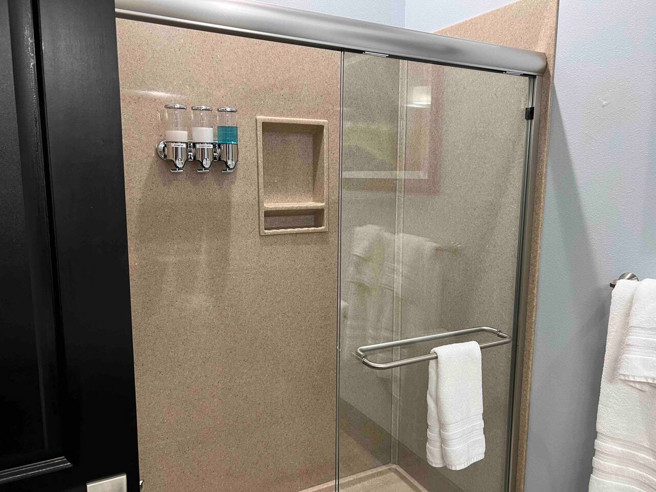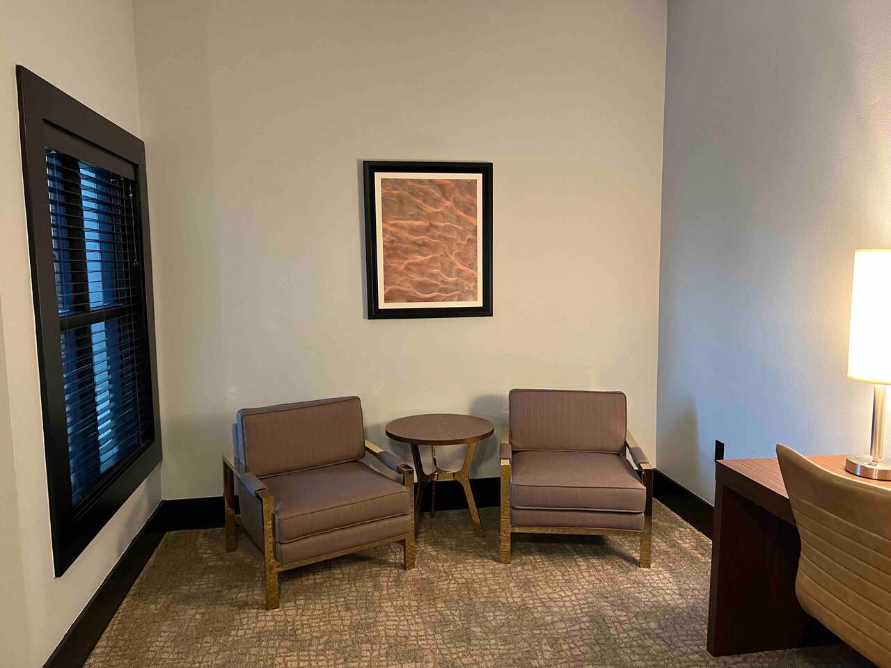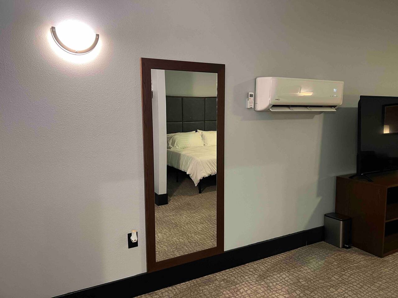 Welcome to our spacious and inviting hotel room, the perfect oasis for your stay. This well-appointed accommodation features two luxurious king-sized beds, ensuring a restful night’s sleep for you and your fellow travelers. A 65” flat-screen television takes center stage, offering a wide range of entertainment options to unwind after a day of adventures. Stay connected effortlessly with our high-speed WiFi, perfect for both work and leisure. For climate control, a remote-controllable thermostat allows you to tailor the room’s temperature to your preference, ensuring your comfort year-round. A soothing ceiling fan adds an extra layer of climate control, providing a gentle breeze on warm days. If business is on your agenda, our well-equipped room boasts a dedicated work area with a desk, making it easy to stay productive. And when you’re ready to relax, a cozy sitting area beckons for moments of tranquility or a chance to sit back and read a book. Our hotel room offers a harmonious blend of comfort, convenience, and sophistication, promising a memorable stay for all our guests.